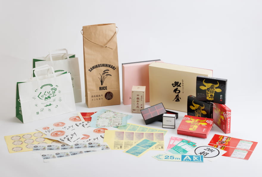 包装紙・箱・容器・シールなどパッケージに関するあらゆる商材から、POP、タグ、プライスカード、メニュー表など、店舗にかかわる商材まで、規格品・オリジナル商品を問わず、お困り事に対してもご提案させて頂きます。